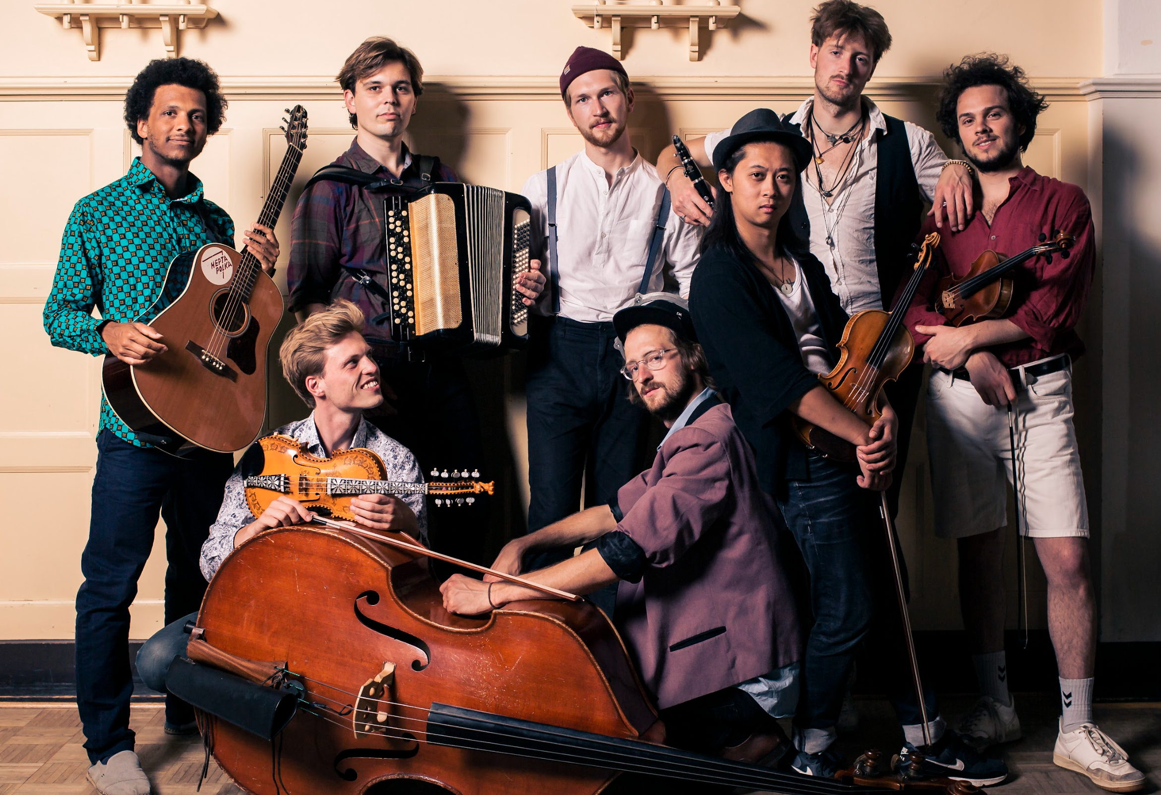 Seit 2017 begeistert die Folkband Hepta Polka auf ganz eigene Art und Weise das Publikum Norddeutschlands und der Welt. Mit Trompetengeige, Hardanger Fiddle und Irish Flute sorgen sie für einen furiosen Wirbel, der, so sagt man, bisher kein Tanzbein hat stillstehen lassen. Fetzige Balkannummern und skandinavische Trads treffen hierbei auf ausgefuchste Arrangement-Ideen und das ein oder andere verschmitzte Lächeln.